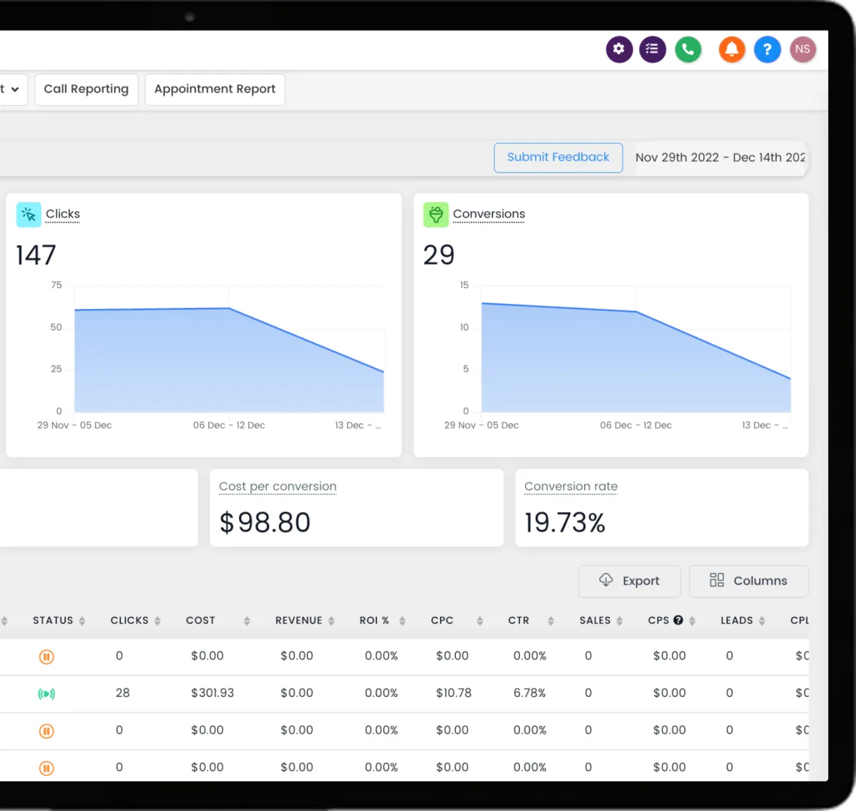 You'll be able to see the ROI and leads in your pipeline with our advanced Dashboard. See stats such as appointment rates, campaign effectiveness, response rates!